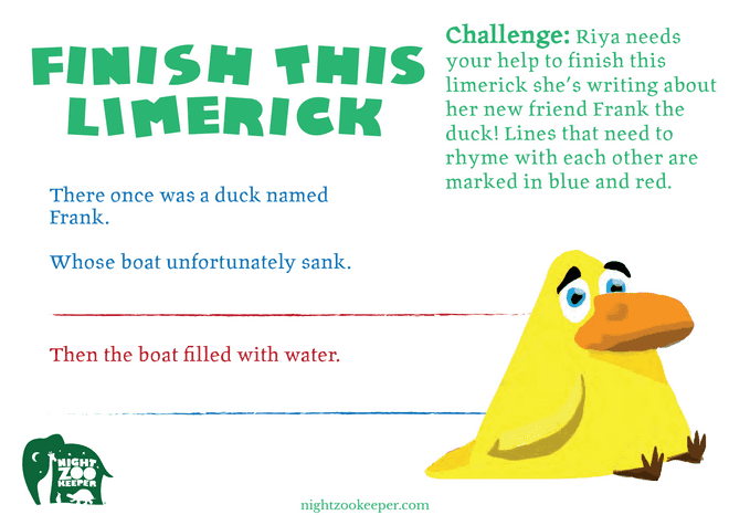 Now that your child has a solid understanding of limerick poems (and even has an example to reference), they are ready to get started with an activity we’ve come up with! In this activity, they will need to use the rhyming pattern we’ve discussed to finish a limerick poem. Good luck!